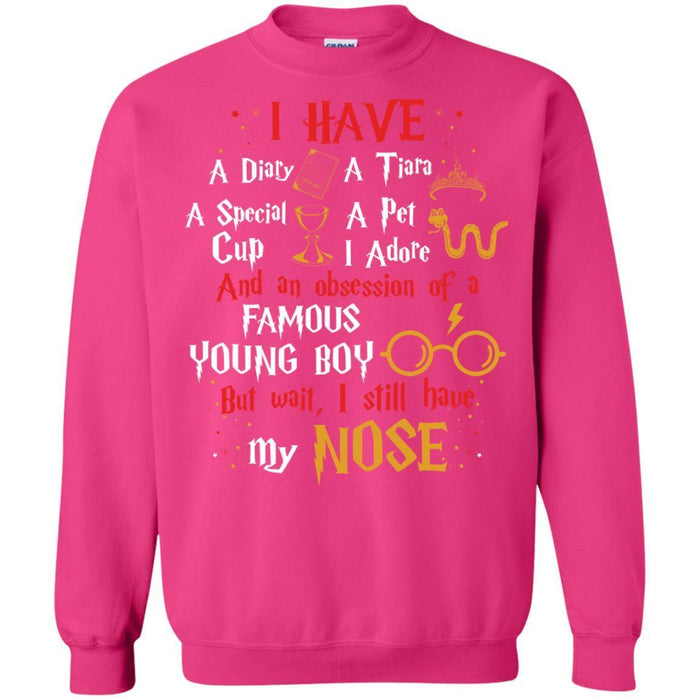 I Have A Diary, A Tiara, A Special Cup, A Pet I Adore And An Obsession Of A Famous Young Boy Harry Potter Fan T-shirt with polyester is extremely soft and breathable and the sublimation printing technique turns out an awesome design. Colors are guaranteed not to fade. Doesn’t wrinkle.