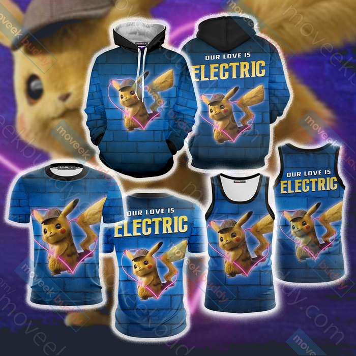 Our Love Is Electric Detective Pikachu New Unisex 3D T-shirt with the big pocket front. It’s a good gift for birthday/Christmas and so on.